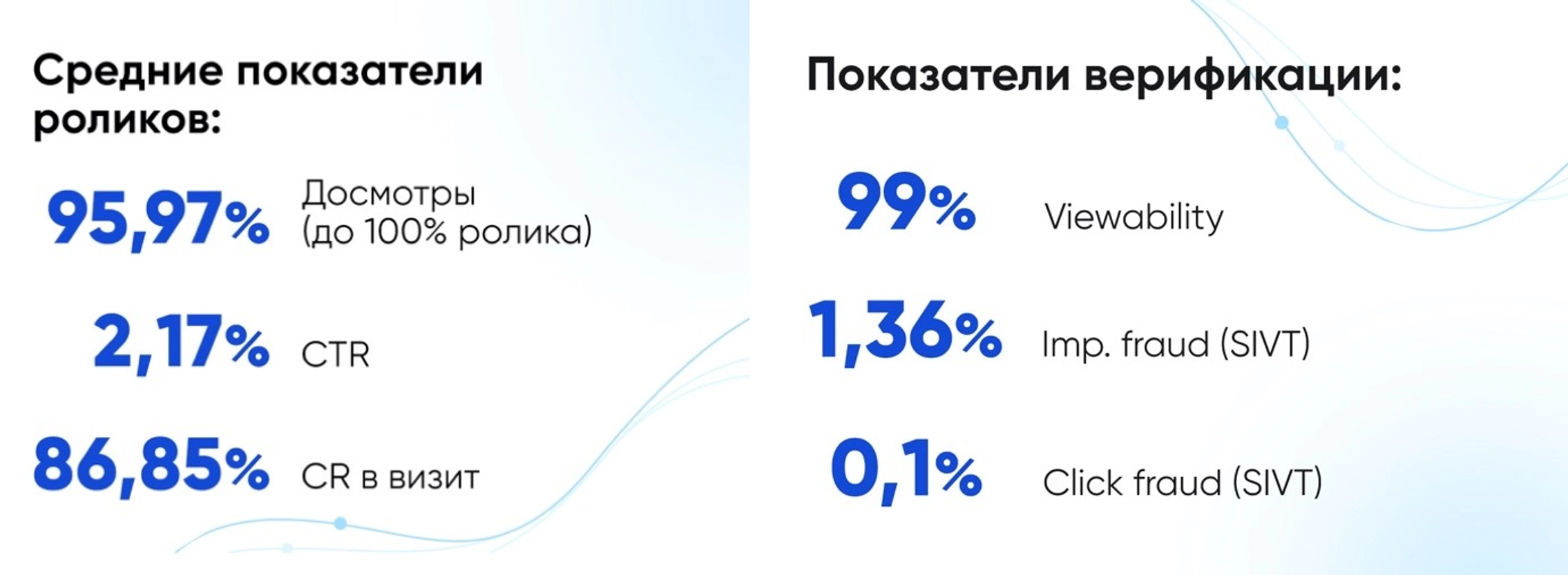 Показатели рекламной кампании подтвердили эффективность размещений на OLV-инвентаре в рамках Партнерской сети ГПМ. Также команда достигла высоких показателей по просмотрам роликов.