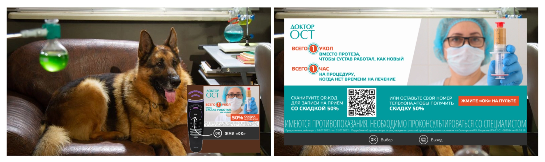 Кампания проходила с 15 по 31 июля 2022 года на телеканалах ТНТ и НТВ, входящих в состав «Газпром-Медиа Холдинга». Рекламные сообщения таргетировались на жителей Тюменской области старше 30 лет. Креативные информеры с предложением получить скидку показывались непосредственно во время сериалов и программ, а не в рекламном блоке. Это позволило обеспечить максимальную вовлеченность аудитории в момент показа информера. При клике на кнопку «Ок» на пульте открывался микросайт с предложением получить скидку 50% в клинике «Доктор Ост», где зритель мог оставить номер телефона для записи в медицинский центр со скидкой. Также там был размещен QR-код, который вел на страницу с подробностями акционного предложения.