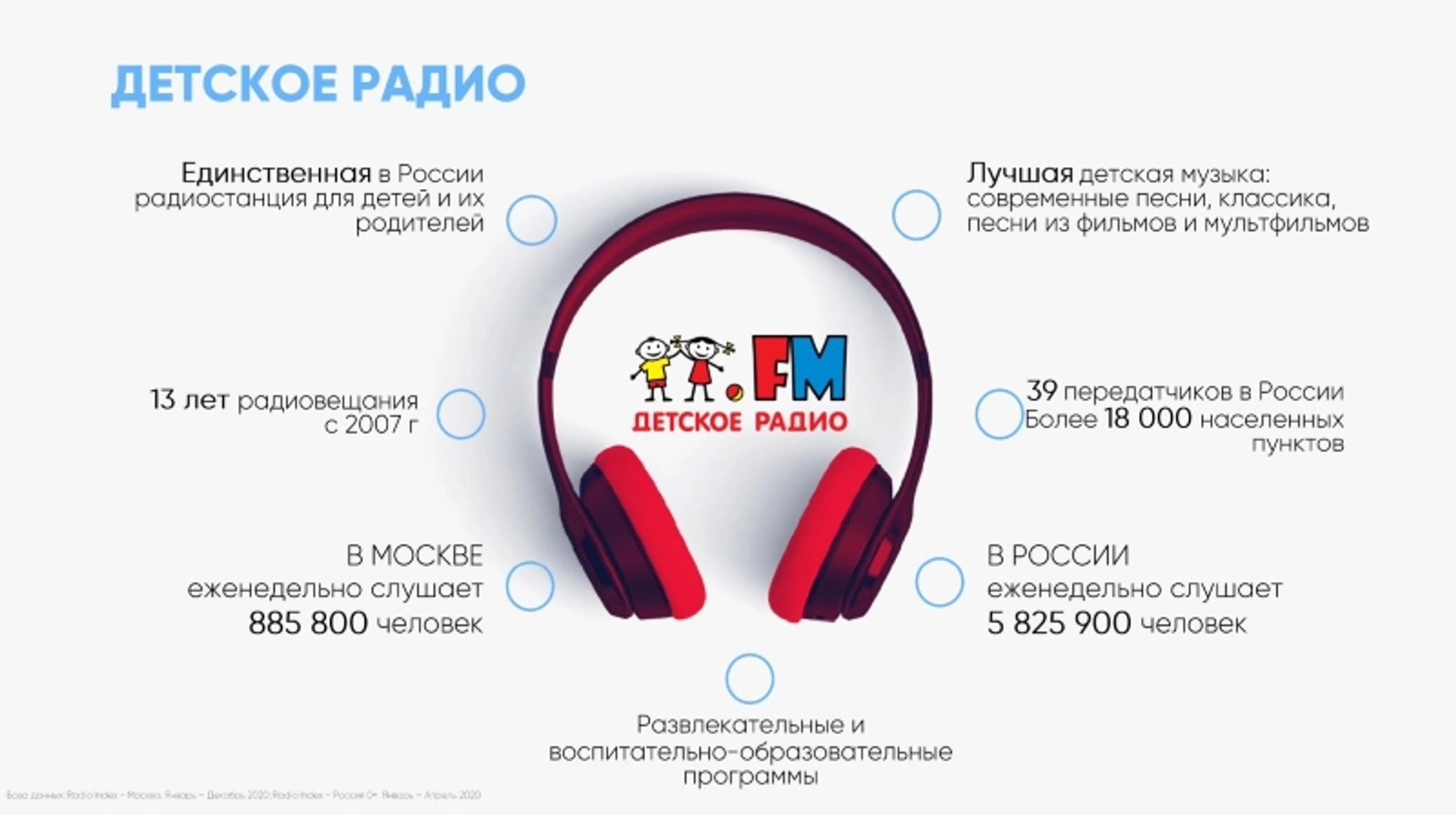 «Детское радио» – единственная в нашей стране радиостанция для детей и их родителей, эфир которой еженедельно охватывает свыше 5,8 млн человек (Mediascope, Radio Index – Россия, аудитория 12+). На деле же слушателей больше, поскольку это радио любят не только подростки, но и малыши. Именно здесь звучит лучшая детская музыка, собрана по-настоящему уникальная коллекция любимых сказок и самых популярных песен из мультфильмов.