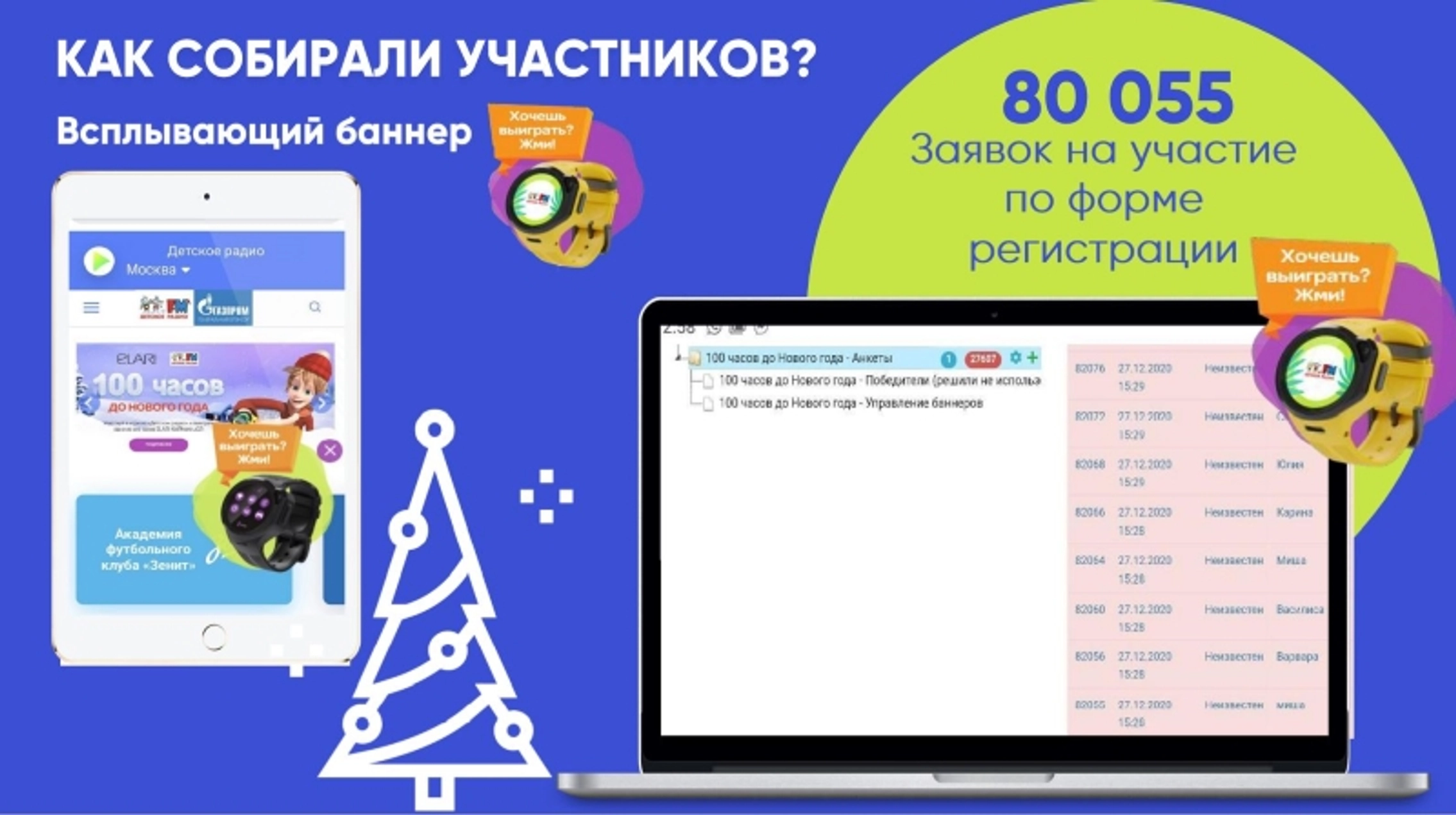 Суперподарки к Новому году – умные часы – разыгрывали в эфире и на сайте «Детского радио» в течение трех недель. Чтобы попасть в игру, необходимо было «поймать» условный сигнал «100 часов до Нового года», в тот же миг кликнуть на баннер с часами на deti.fm и заполнить специальную анкету. Самые оперативные слушатели – родители и их малыши – получили возможность принять участие в умной игре в эфире «Детского радио» и выиграть ценный приз. Состоялось 75 эфирных игровых эпизодов, а еще 25 многофункциональных смарт-часов разыграли в соцсетях ровно за 100 часов до Нового года (по московскому времени). Всего же сто мальчишек и девчонок, победителей игры «100 часов до Нового года», встретили 2021 год с крутым высокотехнологичным гаджетом на руке.