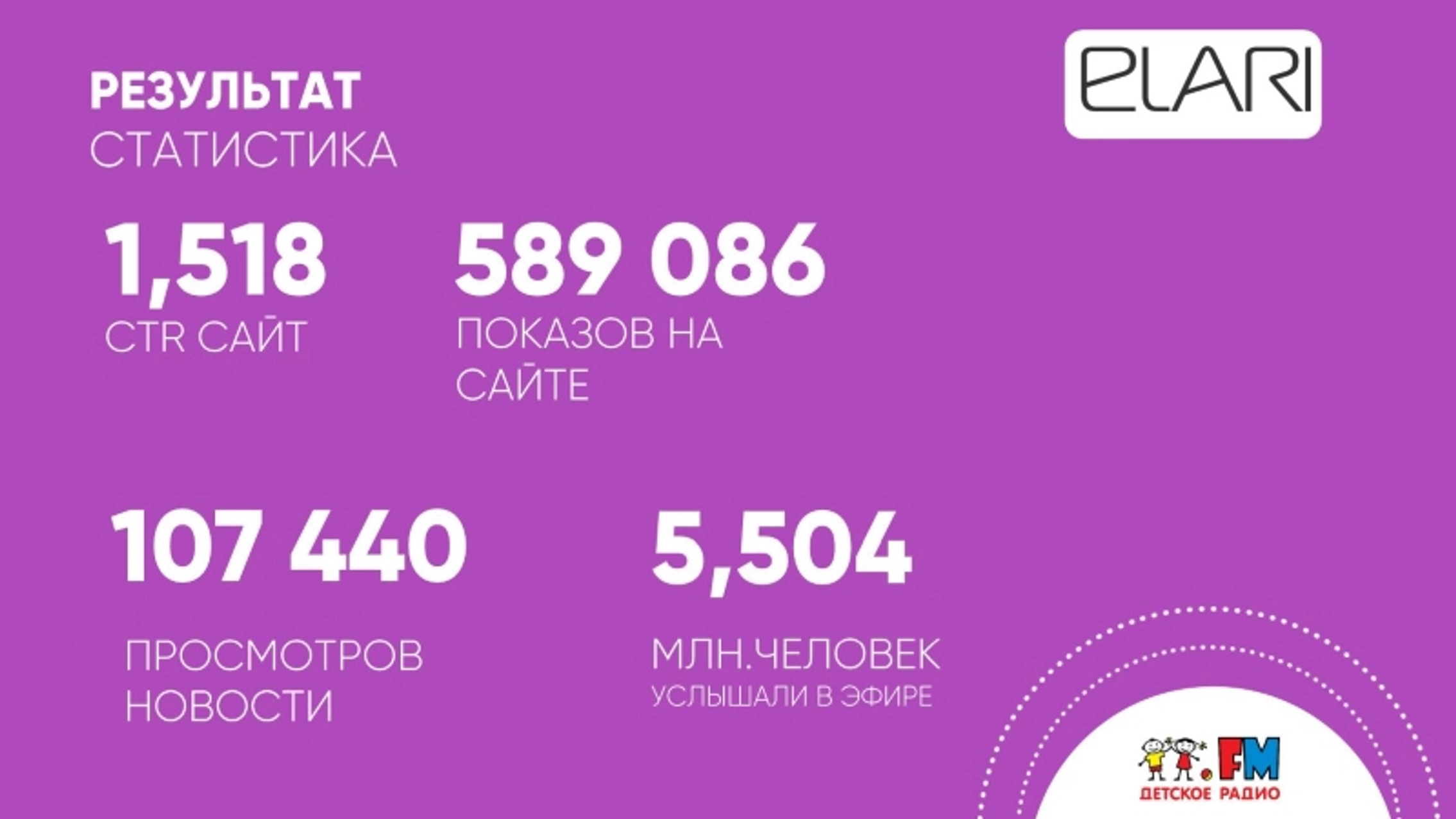 По результатам проекта, 5,5 млн человек услышали об игре «Детского радио» и часах ELARI в эфире, состоялось свыше 589 тыс. показов на сайте deti.fm и более 107 тыс. прочтений новостей в соцсетях. Показатель CTR (отношение числа переходов по баннеру к числу его показов) – 1,518%.