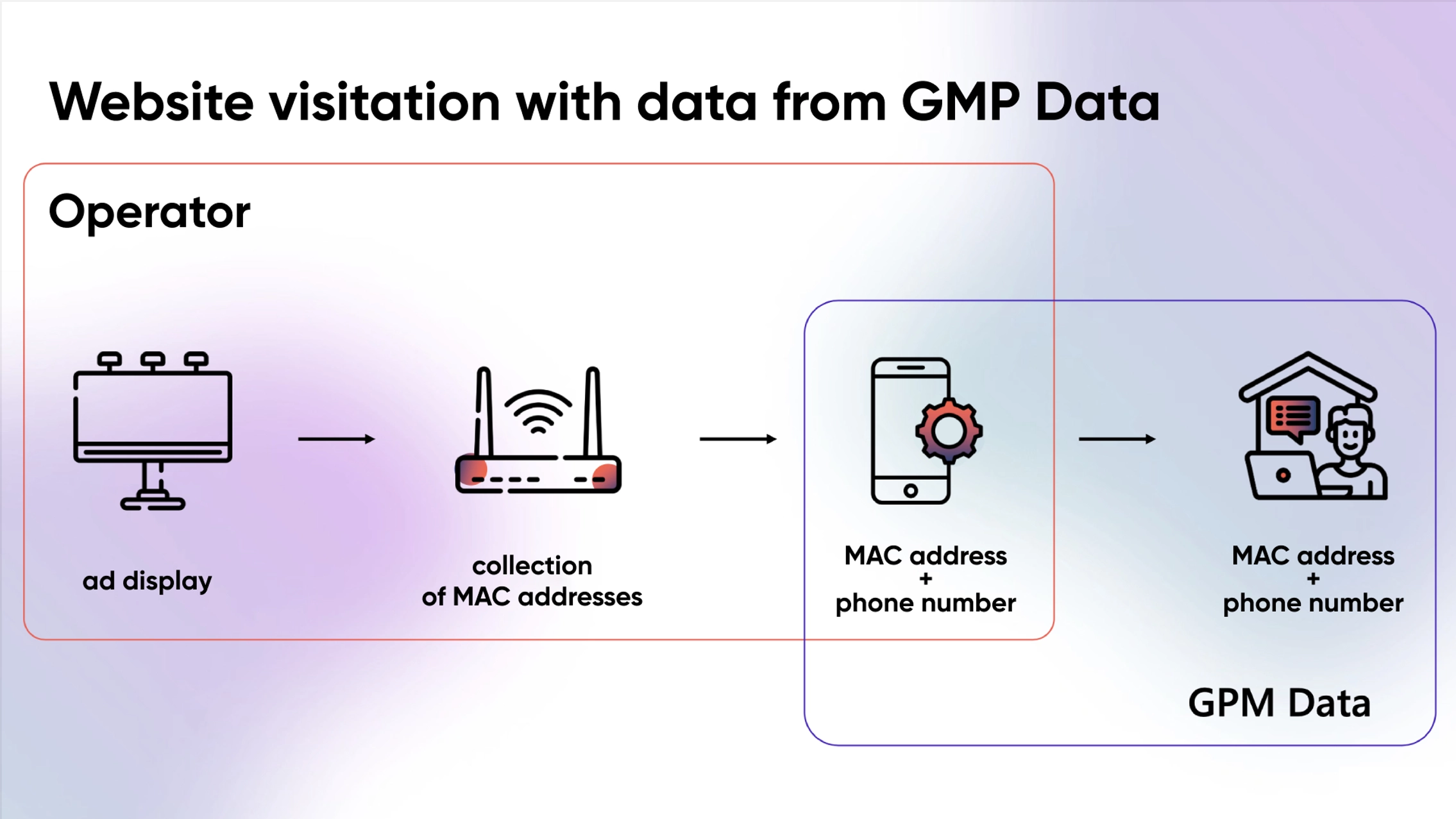 Wi-Fi sniffers installed on the operator’s digital surfaces read the hashed MAC addresses of mobile devices located within the “coverage zone” of a digital advertising screen. GPM Data then enriched the obtained anonymized data with user phone numbers and compared it to cookie data collected through a pixel on the advertiser’s website.
