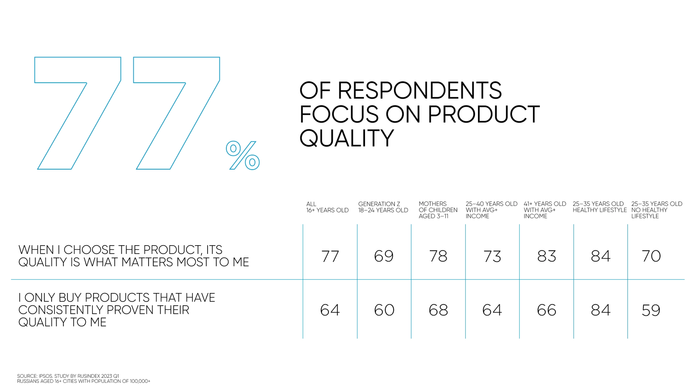 According to the survey, the primary criterion for consumer choice is product quality. The majority (77%) of respondents consider quality to be the deciding factor when purchasing goods. Meeting this requirement (especially among audiences aged 41+ and 25–35 year-olds who are interested in a healthy lifestyle) can become a key area of development for companies. Experts, opinion leaders, bloggers, and media personalities can help companies win over Russian consumers. This can be a kind of quality seal in the eyes of customers.