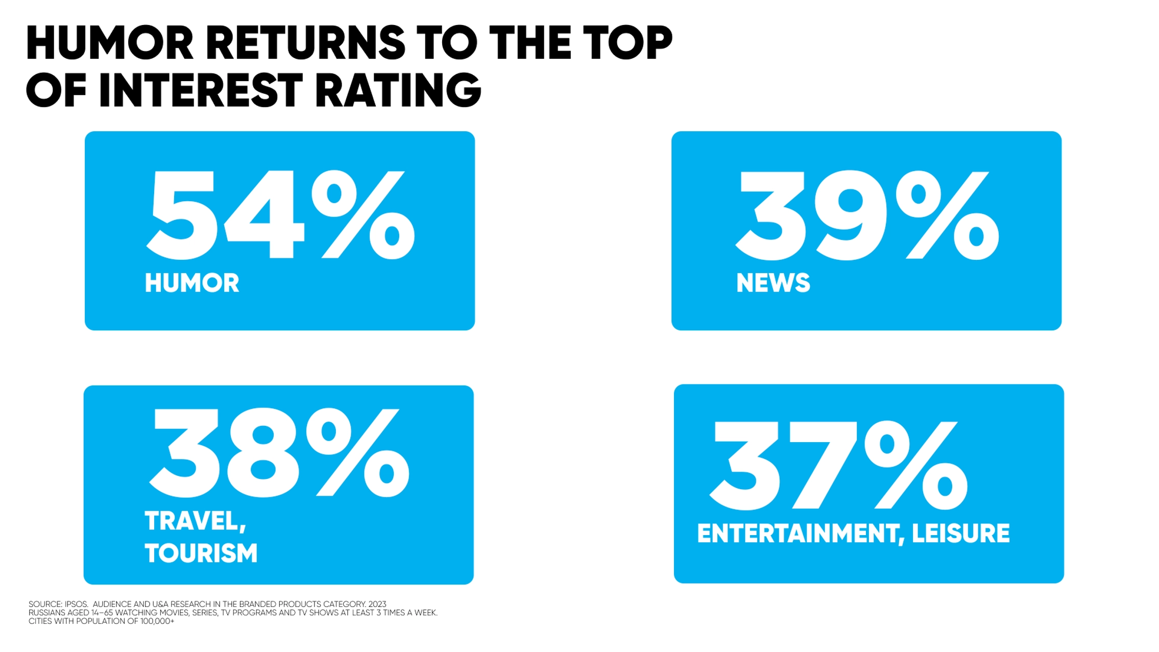 People need good news, vivid impressions, and positive emotions, including those they get from shopping. Comedic content tops the list of interests, comprising 54% of all content consumed. This is followed by news, travel, tourism, and entertainment, which account for around 40%. This suggests that people are tired of the stressful environment and are looking for distractions. Entertaining content helps them keep their mental health in check.