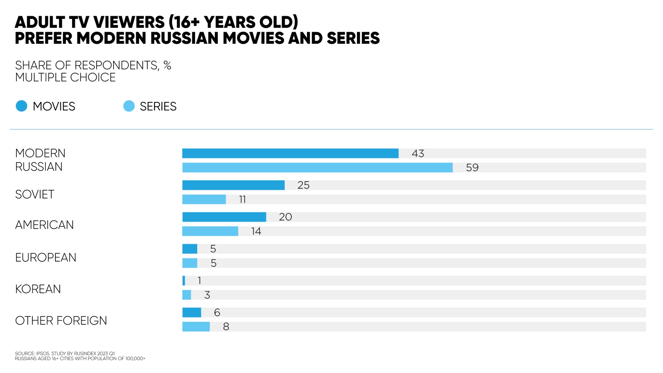 Russian brands are trusted. More than a third (35%) of Russians tend to choose locally produced products and prefer Russian brands on store shelves. This trend is prevalent not only in household goods, but also in media products. According to research, adult TV viewers prefer modern Russian films (43%) and series (59%).
