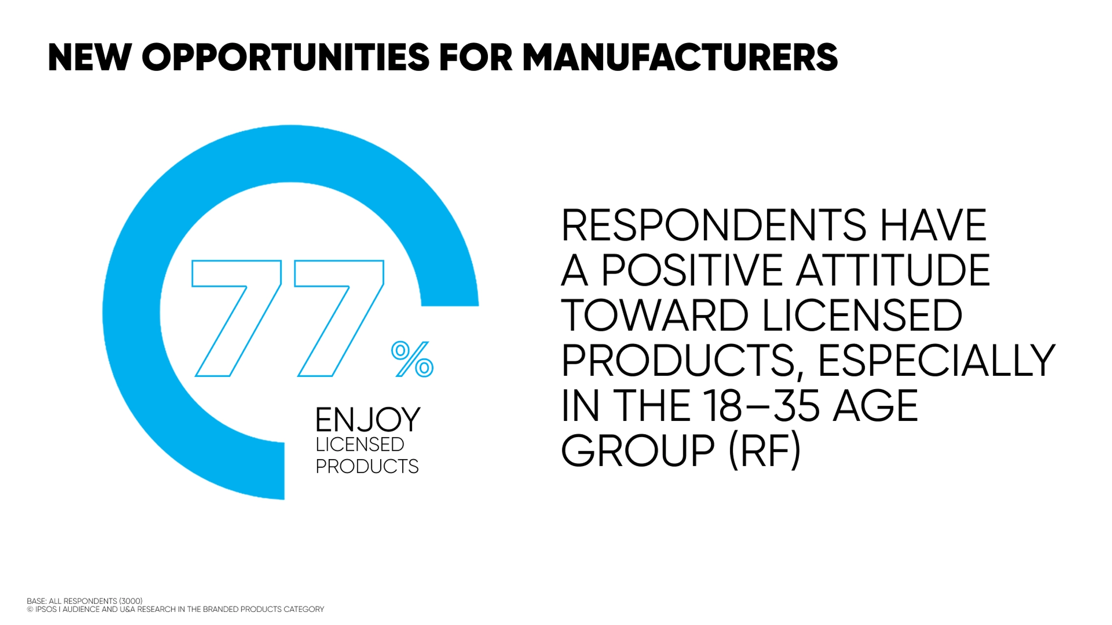 The study confirms that consumers prefer licensed products: 77% of the population have a positive attitude towards licensed products and are willing to purchase them. The percentage is particularly high among buyers aged 18 to 35.