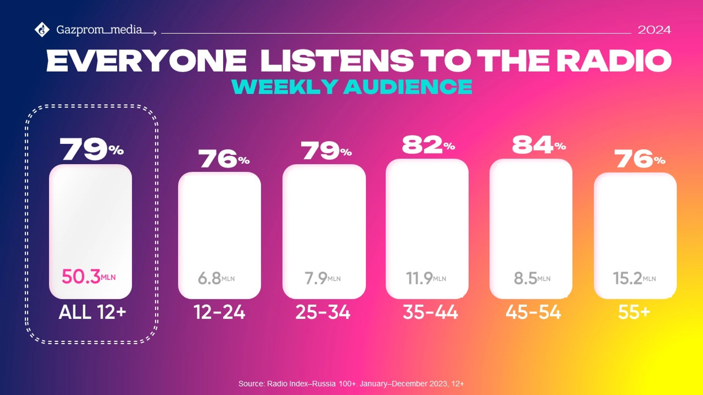 Today, radio holds a strong position in the media consumption habits of Russians. Radio reaches 79% of the Russian population over the age of 121, with the weekly audience of Gazprom-Media Holding’s radio stations reaching 31.8 million people, or 49.9% of the country’s population2. The growing popularity of smart speakers is also having a positive impact on radio listenership. Since 2021, radio consumption through smart speakers with voice assistants has increased by 45%3, and by the end of the first quarter of 2024, smart speaker sales in Russia grew by 33.3% compared to the same period in 2023, exceeding 1 million gadget purchases4.