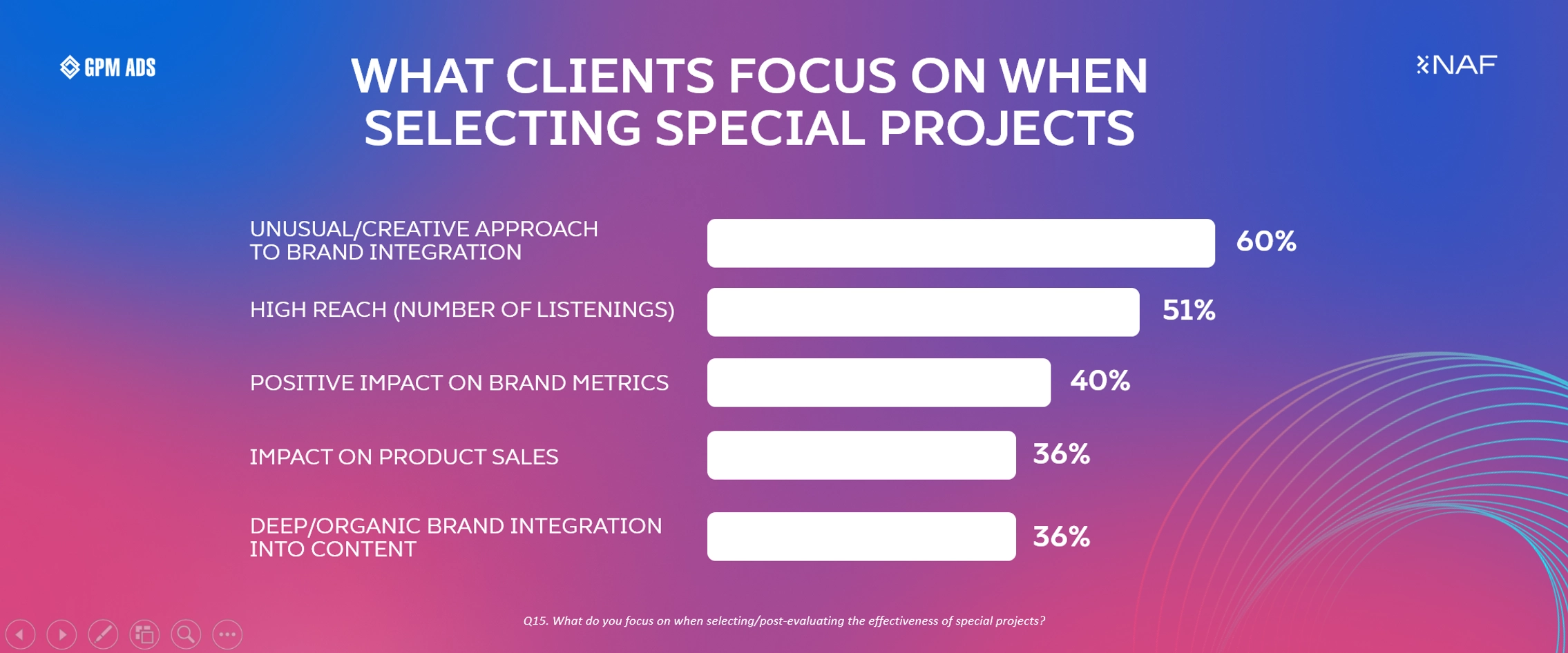40% of respondents also noted the positive impact of special radio projects on brand metrics. An equal percentage (36% each) evaluate the campaign’s impact on product sales and the ability to integrate the brand into media content when selecting a special project or analyzing its effectiveness.