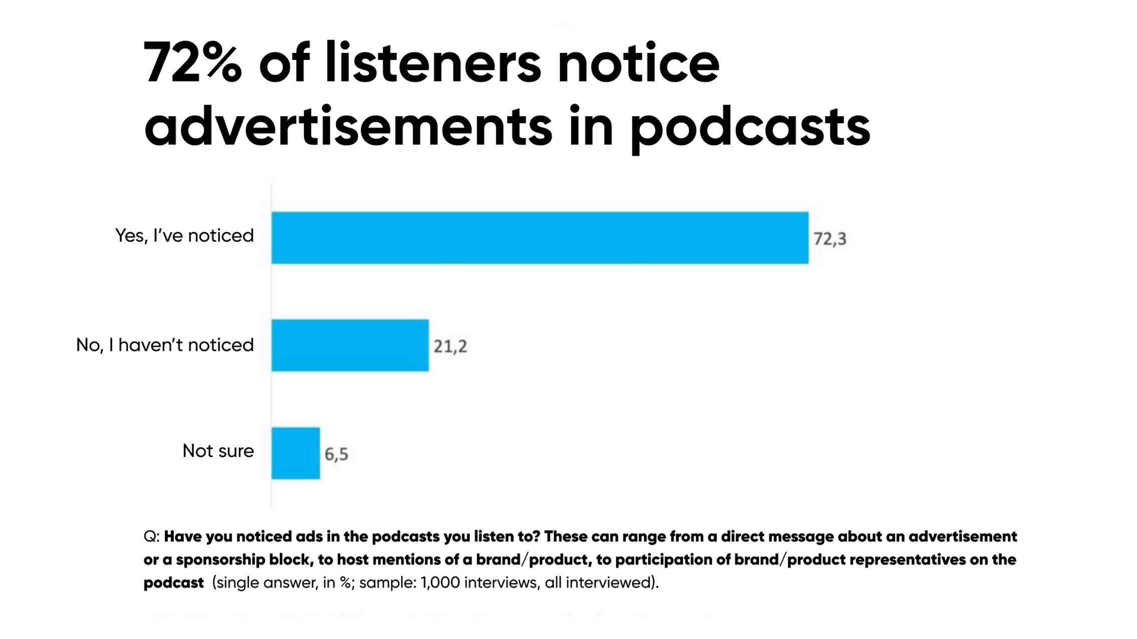 The pandemic in 2020 tangentially influenced the development of podcast advertising. Due to lockdown, remote work etc. users were more likely to “hang out” online. In order to retain or attract audiences, many services have turned to the digital format, leading to the active development of podcasting. Moreover, this trend continued even after most quarantine restrictions were lifted. Judging by the rate of growth in content consumption via smartphones over the past two years (+67% compared to 2020**), it may soon be on a par with other popular digital audio formats. The results of the research validate our experience in this area. Our holding identifies podcast advertising as one of the most exciting opportunities among special projects. We can observe a positive attitude of the audience towards this way of communication, and we can see the growing interest of our clients. Accordingly, we have plans to continue our involvement in the utilization and advancement of this and other modern and impactful marketing tools.