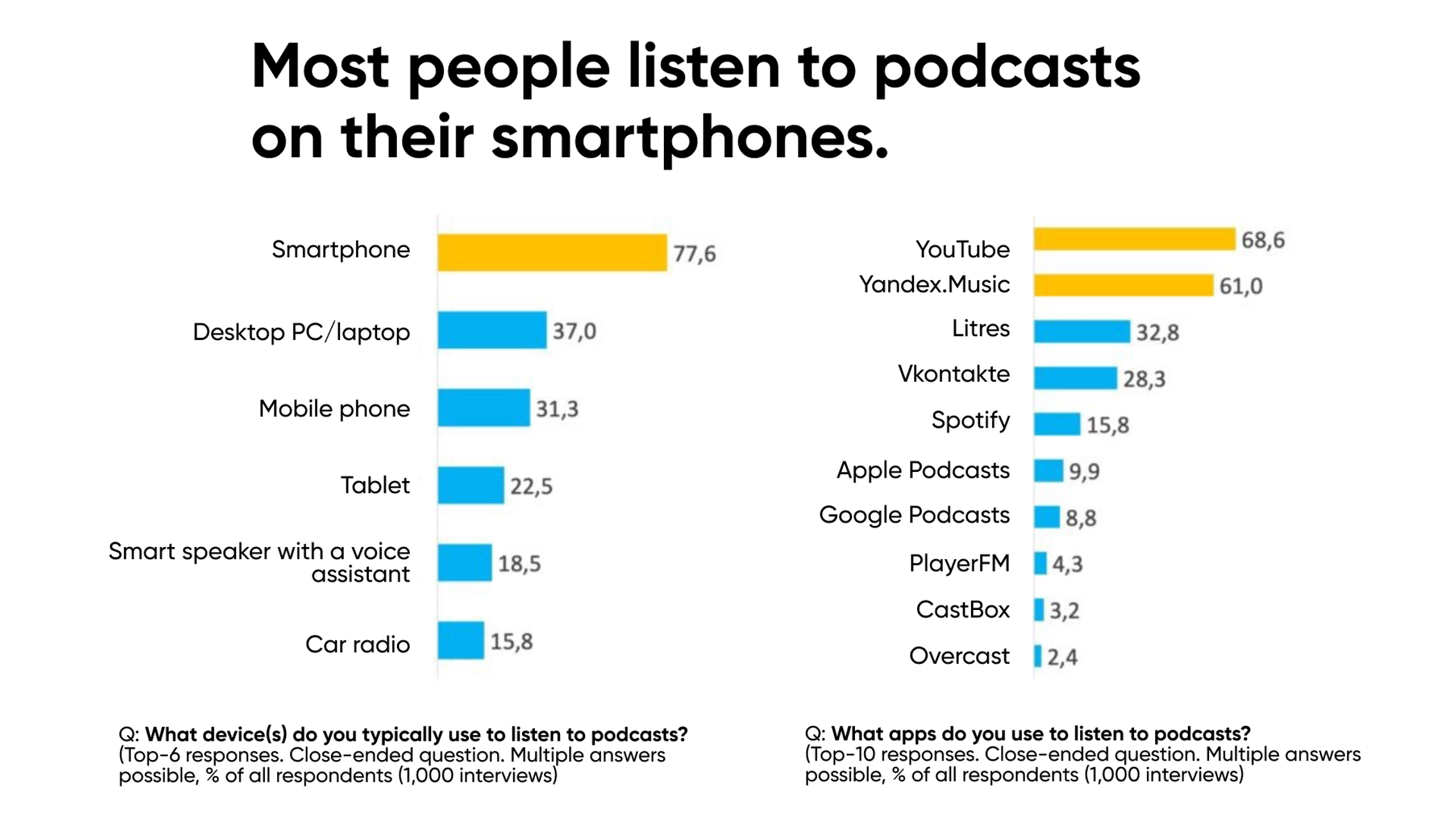 The data for a comprehensive analysis of the major trends were collected from a representative online survey of men and women aged between 16 and 55 who listen to podcasts at least once a month. 1,000 interviews were conducted in Russian cities with more than 100 thousand residents. The primary objective of the research was to assess the attitude of the audience towards advertising in podcasts and smart speakers. The survey questions posed to the respondents focused on the frequency and locations where they listen to podcasts, the choice of devices and applications, and the attitude towards advertising in podcasts. According to the data obtained, podcasts are most commonly listened to on smartphones—this was the answer of 77.6% of respondents; only 18.5% of survey participants mentioned a smart speaker with a voice assistant, and other selected devices included a desktop PC/laptop (37%), a mobile phone (31.3%), a tablet (22.5%), and a car radio (15.8%). The most popular applications for listening to podcasts are YouTube (68.6%) and Yandex.Music (61%).