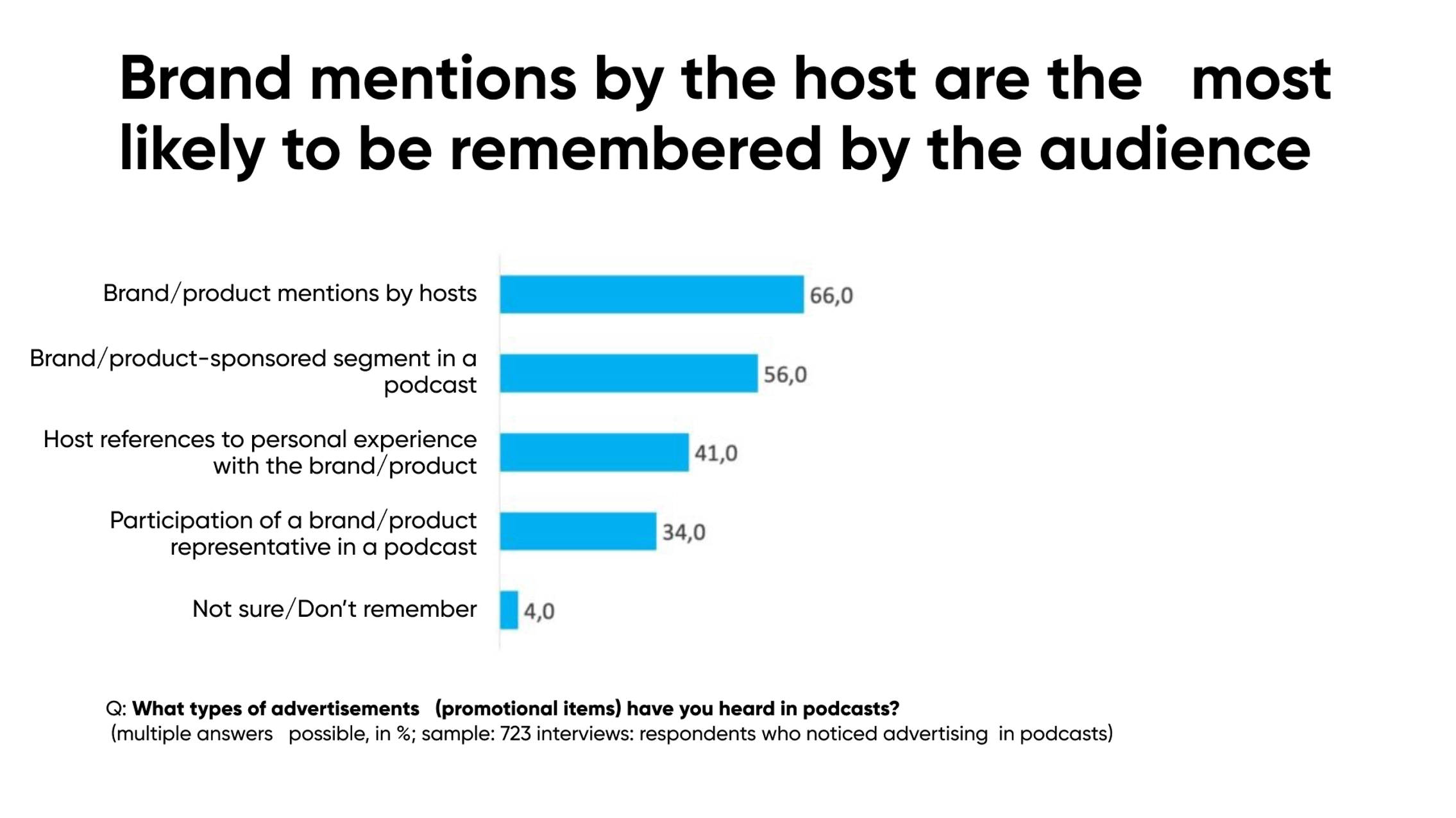Brand mentions by the podcast host are the most likely to be remembered by the audience. 66% of those who noticed ads in podcasts noted that they heard the name of a trademark or product during the broadcast; more than a half (56%) noticed a sponsorship segment in the podcast. 46% of the respondents said that the podcast host’s mention of a brand or appeal to personal experience with a product does not distract them from listening, and 42% of the listeners trust the presenter’s words about such personal experience.