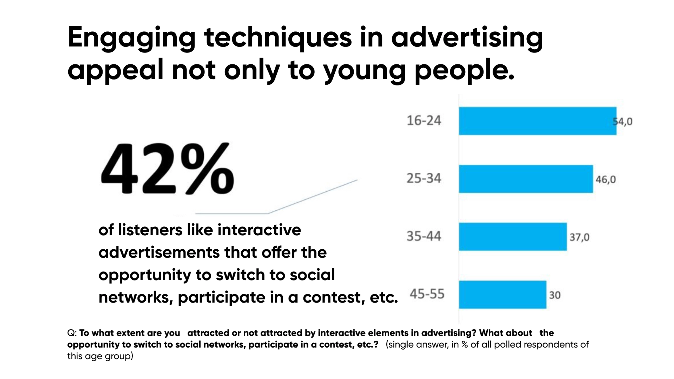 Engaging techniques in advertising are not only interesting for young people. Interactive advertising in podcasts (voice integrations with an offer to switch to social media, enter a contest, etc.) is attractive to 42% of the audience. The listeners in the age categories from 16 to 24 years and from 25 to 34 years respond most actively to this form of advertising, with 54% and 46% respectively. These indicators are naturally lower for the older audience: interactive advertising was preferred by 37% of the respondents aged from 35 to 44 years and by 30% of those from 45 to 55 years.