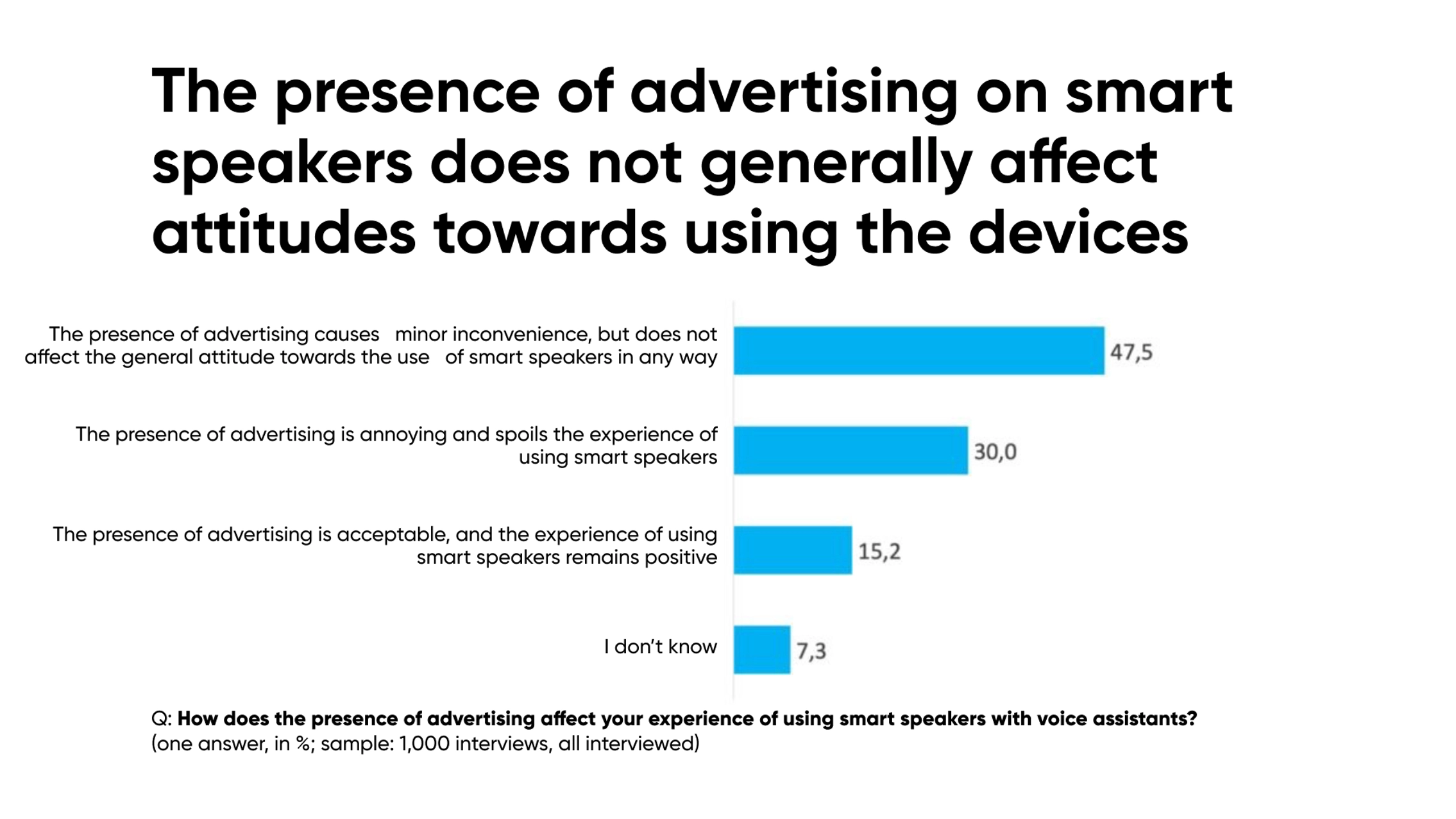 The attitudes towards advertising via smart speakers is neutral. 47.5% of the surveyed respondents noted that the presence of advertising on smart speakers with a voice assistant does not generally affect their attitudes towards using these devices. Another 15% of listeners perceive advertising normally, provided it does not detract from their overall enjoyment of using an audio speaker. At the same time, the indicators of ad noticeability for smart speakers are slightly lower compared to podcasts in general. Only 55% of listeners who have ever used smart audio speakers with voice assistants have noticed advertising.