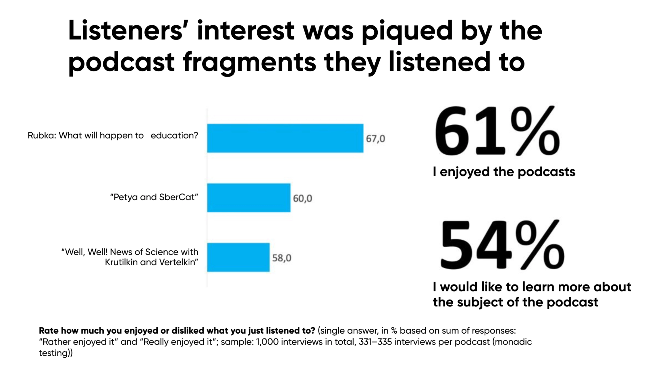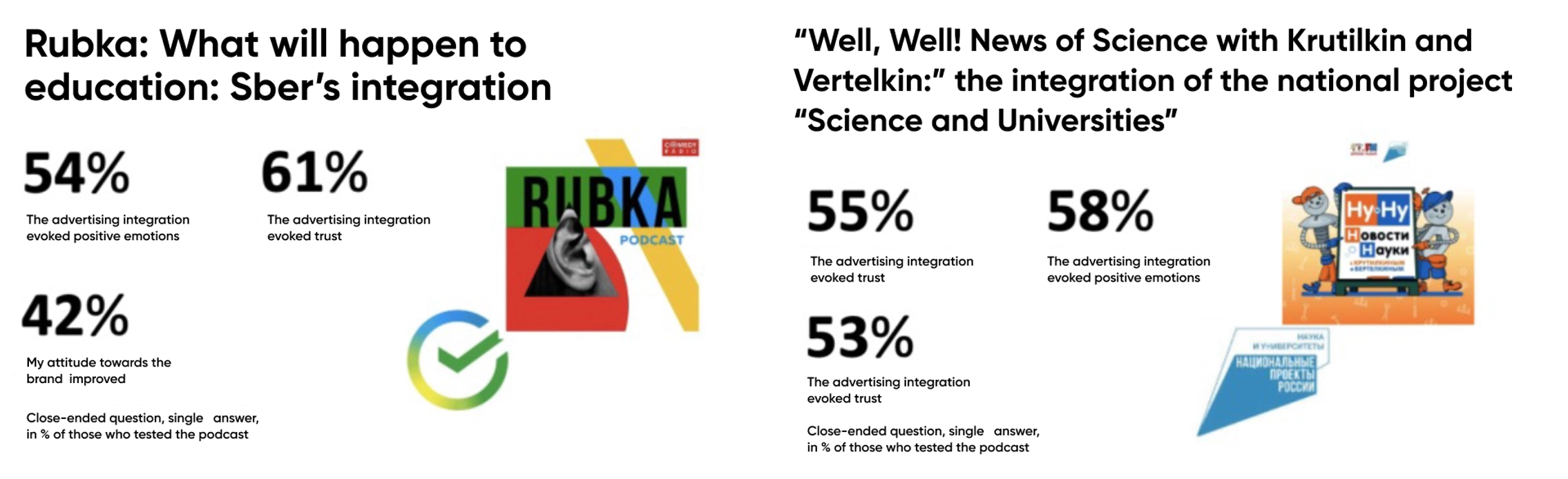 In the scope of the research, the listeners were also asked to listen to podcast segments of GPM Radio (part of Gazprom-Media Holding) in order to assess the level of attention drawn by specific advertising integrations among the audience. The proposed projects included Rubka, a podcast by the Comedy Radio team, in which a student loan program from Sberbank was integrated into one of programs on education. The research also covered some brand podcasts—original shows commissioned by advertisers. These are “Petya and SberCat,” implemented by Sberbank in collaboration with Detskoe Radio, and “Well, Well! News of Science with Krutilkin and Vertelkin,” another client podcast of Detskoe Radio with the integration of the national project “Science and Universities.” By analyzing these projects, it was revealed that listeners are more receptive to advertising when it is presented alongside high-quality content.