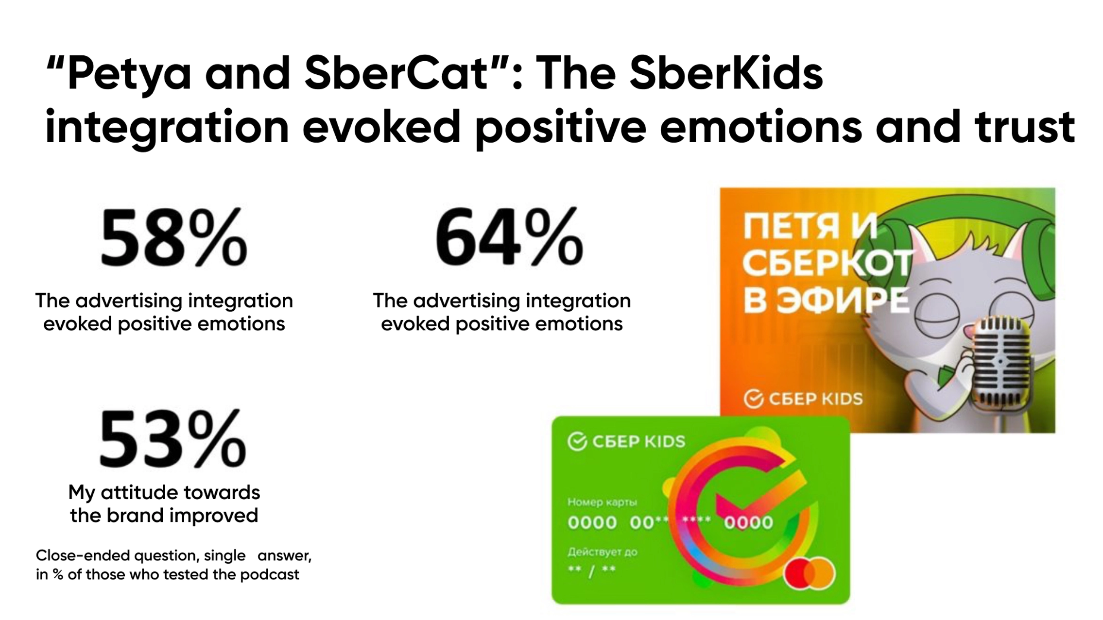 61% of the respondents enjoyed the podcasts, and 54% wished to learn more about the content of the integration. Most listeners’ attitudes toward the advertised brands improved after the broadcast. For example, 58% of those who listened to “Petya and SberCat” felt positive about the SberKids advertisement, and 64% felt confidence in the advertising integration. Two other GPM Radio projects achieved similar results.