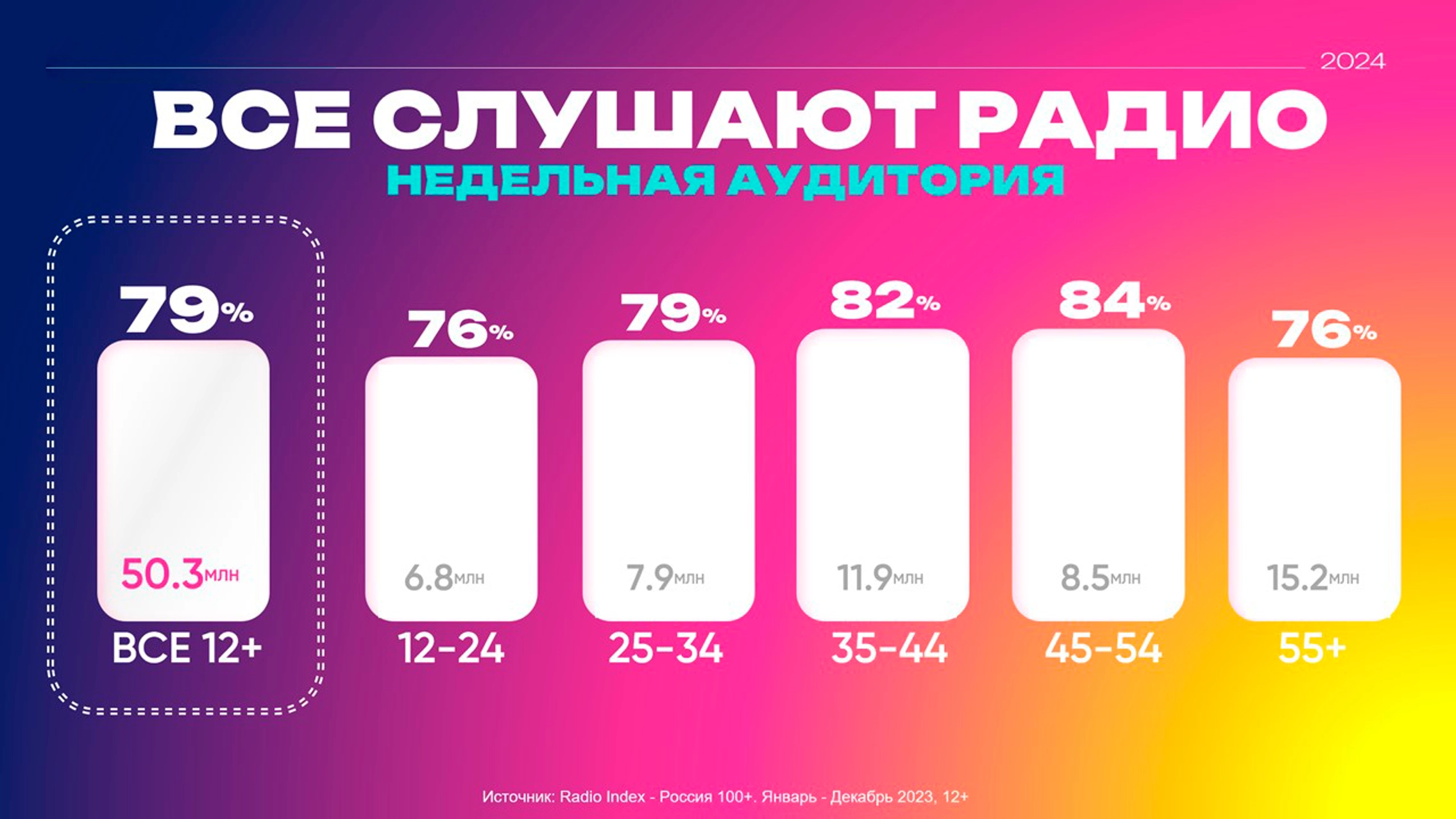 Сегодня радио занимает прочную позицию в медиапотреблении россиян. Радио охватывает 79% населения России возраста 12 лет и старше1, при этом еженедельная аудитория на радиостанциях «Газпром-Медиа Холдинга» достигает 31,8 млн человек, что составляет 49,9% населения страны2. На прослушивание радио позитивно влияет и растущая популярность умных колонок. C 2021 года на 45% увеличилось радиопотребление через умные колонки с голосовыми помощниками3, а по итогам первого квартала 2024 года их продажи в России выросли на 33,3% в сравнении с тем же периодом 2023-го, превысив количество покупок в 1 млн гаджетов4.
