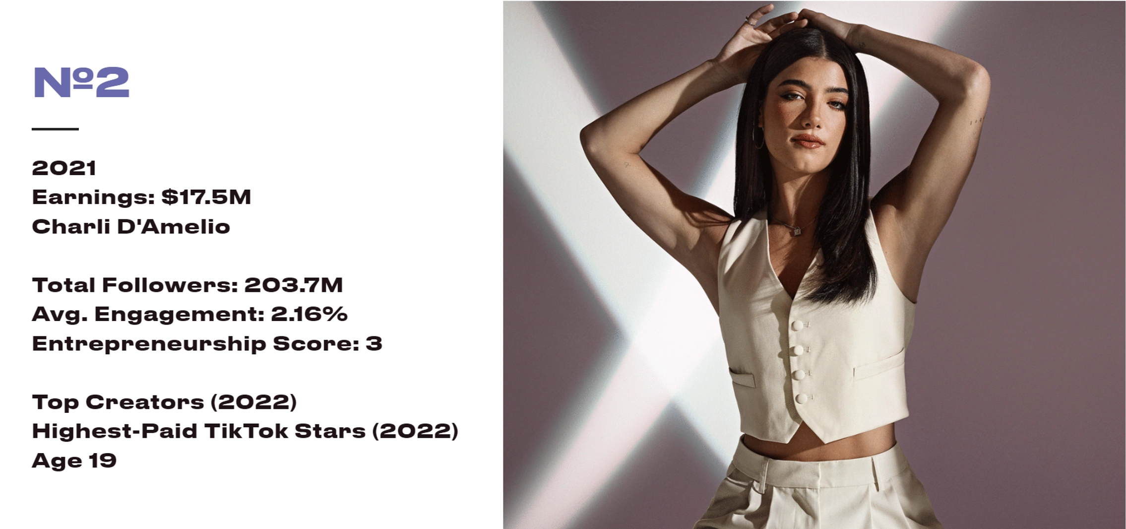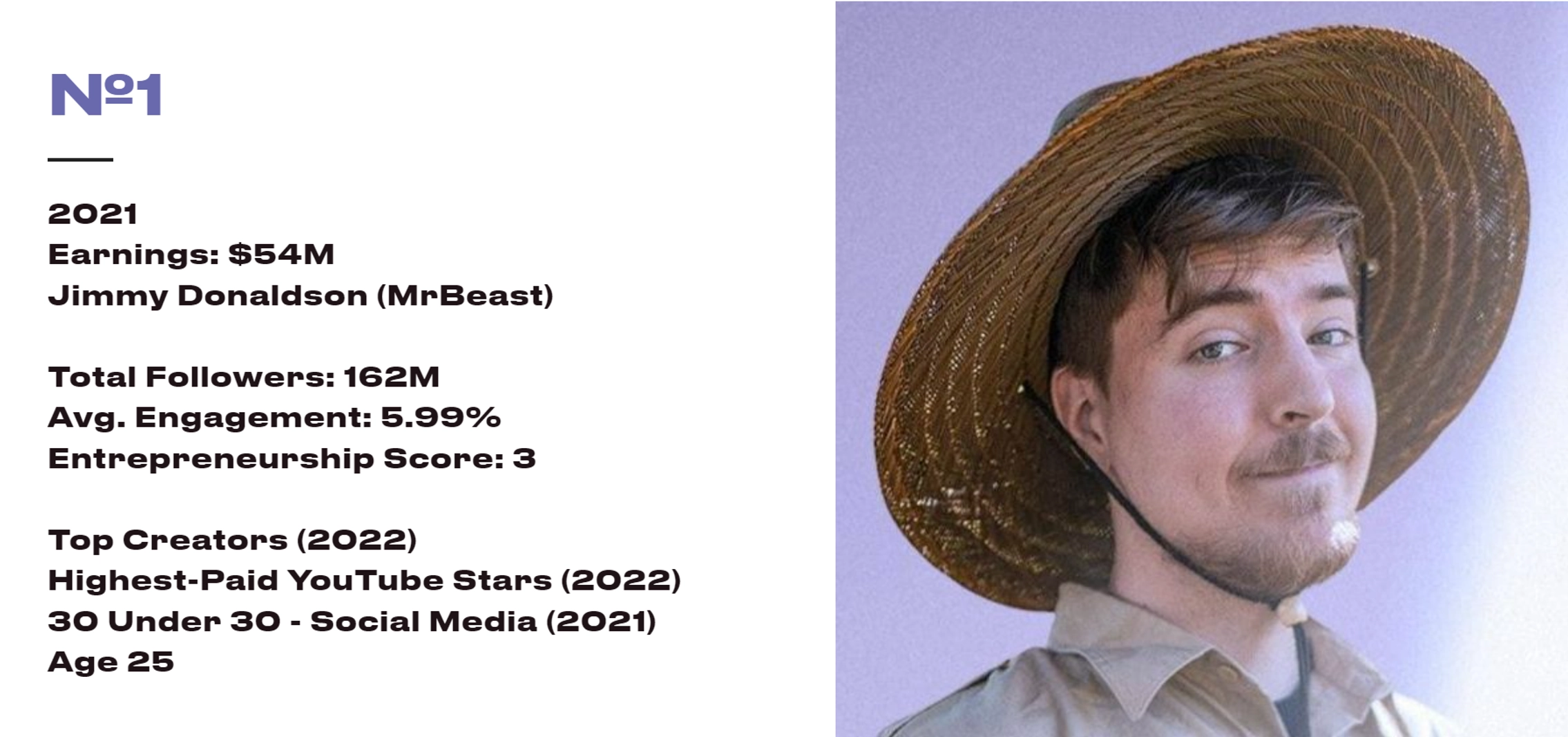 Forbes has compiled a Top Creators 2022 ranking of 49 top creators and 1 dog. Forbes ranked each creator in three categories: earnings, clout and entrepreneurship. Their average age is 31 years old. In 2021, they collectively earned $ 570 mln and collected 1.9 bln followers on TikTok, YouTube and Instagram (Instagram is prohibited in Russia; it is owned by Meta Corporation, which is recognised as extremist in Russia).