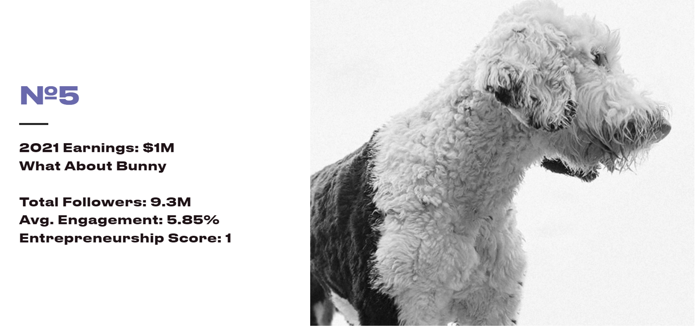 Первое животное, попавшее в список Forbes! Говорящий шепадудль смог привлечь более 1,1 млн подписчиков в Instagram (соцсеть Instagram запрещена в РФ; принадлежит корпорации Meta, которая признана в РФ экстремистской), рассказывая своему владельцу о том, что скучает по отцу, любит маму и пахнет чем-то странным. Банни общается со своими двуногими при помощи звуковой панели с 92 кнопками с такими словами как "люблю", "на улицу" и "гоняться", вероятно, используя мышечную память для нажатия на них лапой. Даже если это постановка, она сделала из Банни настоящего бизнес-пса: например, сейчас у неё заключен контракт с постоянно развивающимся брендом кормов для домашних животных Open Farm Pet, и не только с ним.