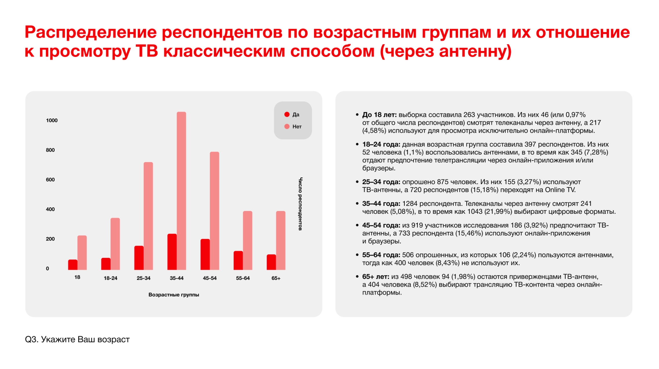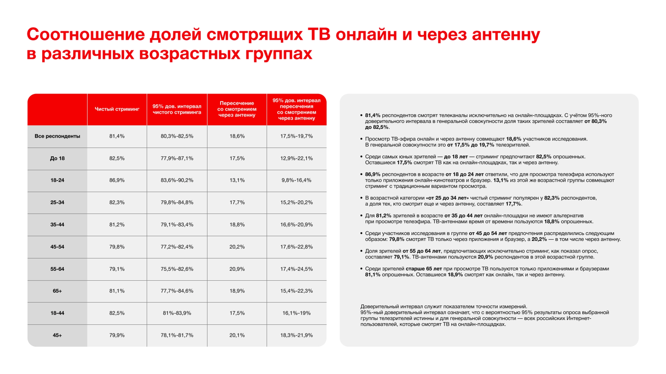 Предпочтения по среде телепросмотра отличаются в зависимости от возраста. Большинство юных зрителей (до 18 лет) обращаются к стриминговым платформам (82,5%). 17,5% опрошенных в этой категории комбинируют просмотр онлайн и через антенну. В аудитории от 18 до 24 лет 86,9% респондентов выбирают приложения стриминговых сервисов и браузер. Приверженцев классического телесмотрения среди них меньше всего — 13,1%. Зрители старше 45 лет, напротив, чаще остальных обращаются к традиционному ТВ — в возрастной группе 55–64 лет их доля составляет 20,9%.