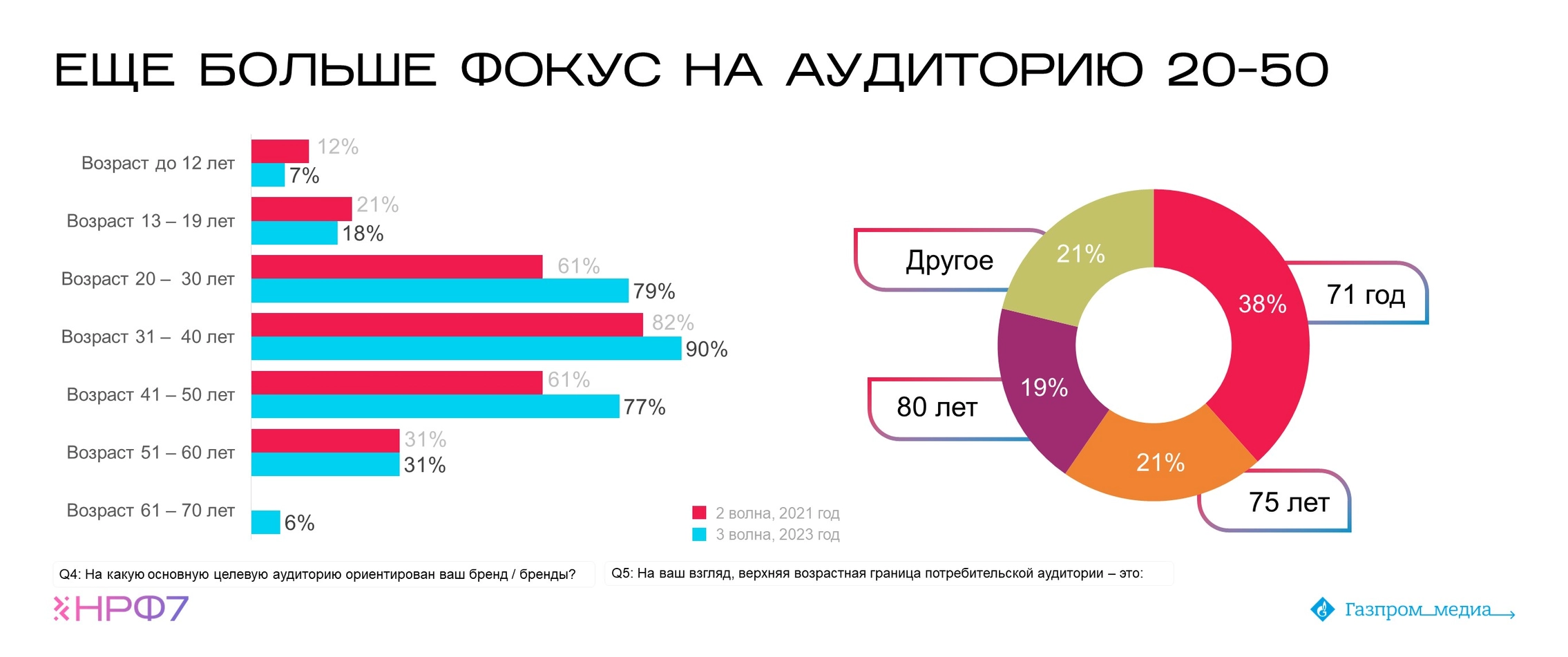 Если говорить о целевой аудитории, большинство брендов продолжают ориентироваться в своих рекламных кампаниях на сегмент в возрасте 20-50 лет. При этом верхняя возрастная граница потребительской аудитории расширилась до 71 года. Для сравнения, в 2021 году большинство респондентов отмечали границу в 65+ лет.