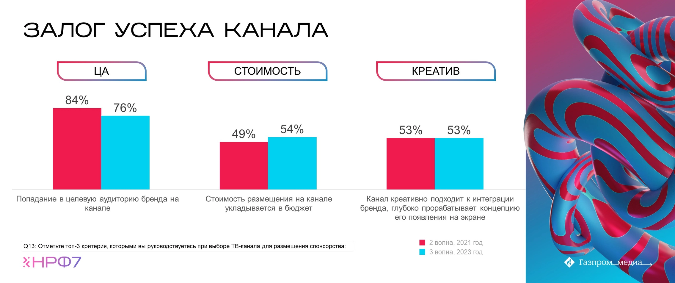 Важный фактор эффективности спонсорства, помимо формы подачи материала, — выбор телеканала. Формула успеха включает три компонента: ЦА, стоимость и креатив.