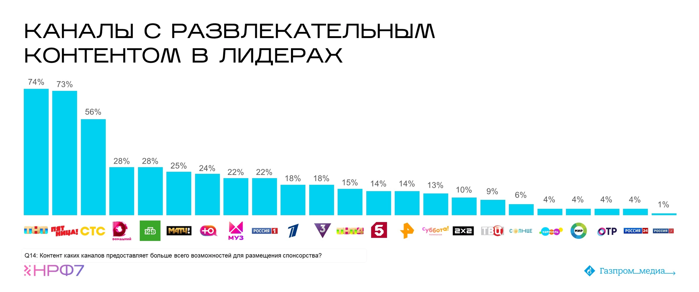 По мнению респондентов, наиболее эффективны развлекательные телеканалы. ТНТ (74%), Пятница (73%) и СТС (56%) — главные спонсорские площадки на ТВ для рекламодателей.