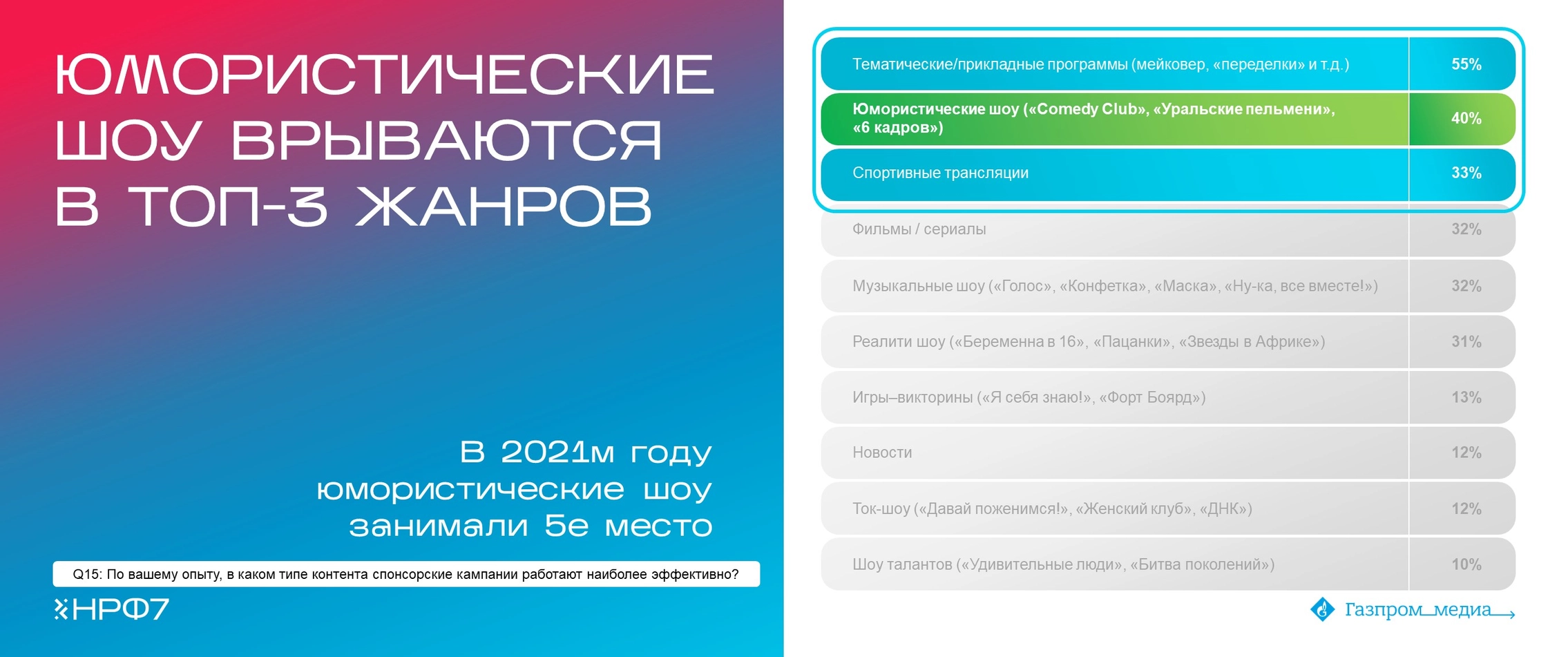 Юмористические шоу вырвались в ТОП-3 жанра, разделив олимп с тематическими программами и спортивными трансляциями. Респонденты отмечают, что именно в таком контенте спонсорство работает наиболее результативно.